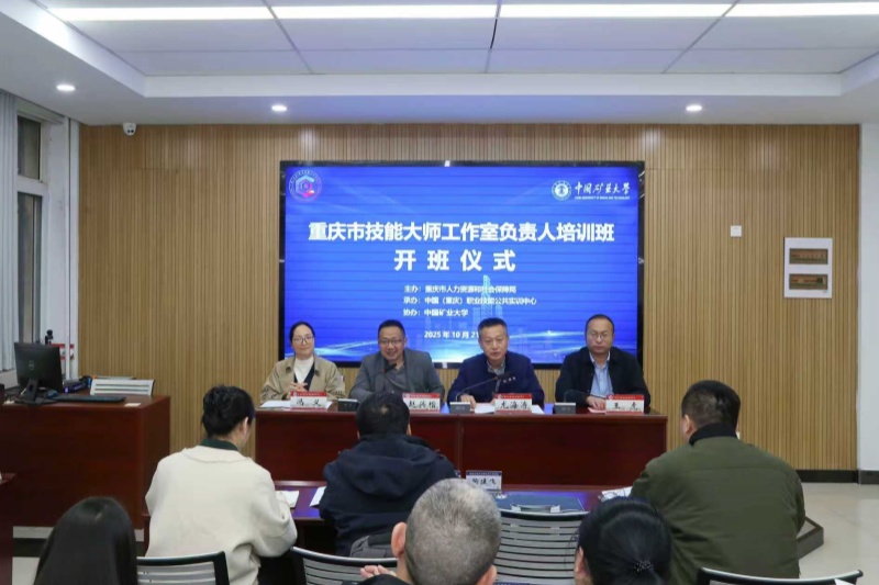 2025年10月21日上午,重庆市技能大师工作室负责人培训班在矿大文昌校区顺利开班。重庆市人力社保局职建处副处长赵兴楷,重庆市职业技能公共实训中心工会主席、财务部部长冯义,中国矿业大学继续教育学院副院长王虎等领导出席开班式,会议由重庆市人力社保局一级调研员龙海涛主持。