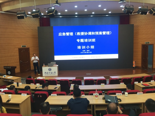 5月22日中午举行了培训小结,我校继续教育学院副院长王虎对培训班的整体情况和广大学员的表现进行总结,省应急管理厅救援协调处副处长吴杰作结业讲话。
