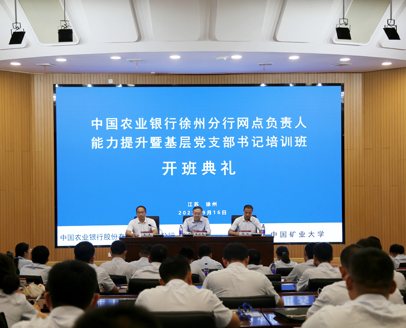 9月16日下午,由中国农业银行徐州分行委托我校举办的中国农业银行徐州分行网点负责人能力提升暨基层党支部书记培训班在文昌校区顺利开班。中国农业银行股份有限公司徐州分行党委书记、行长陈必森,中国矿业大学继续教育学院党委书记周跃出席了开班典礼。