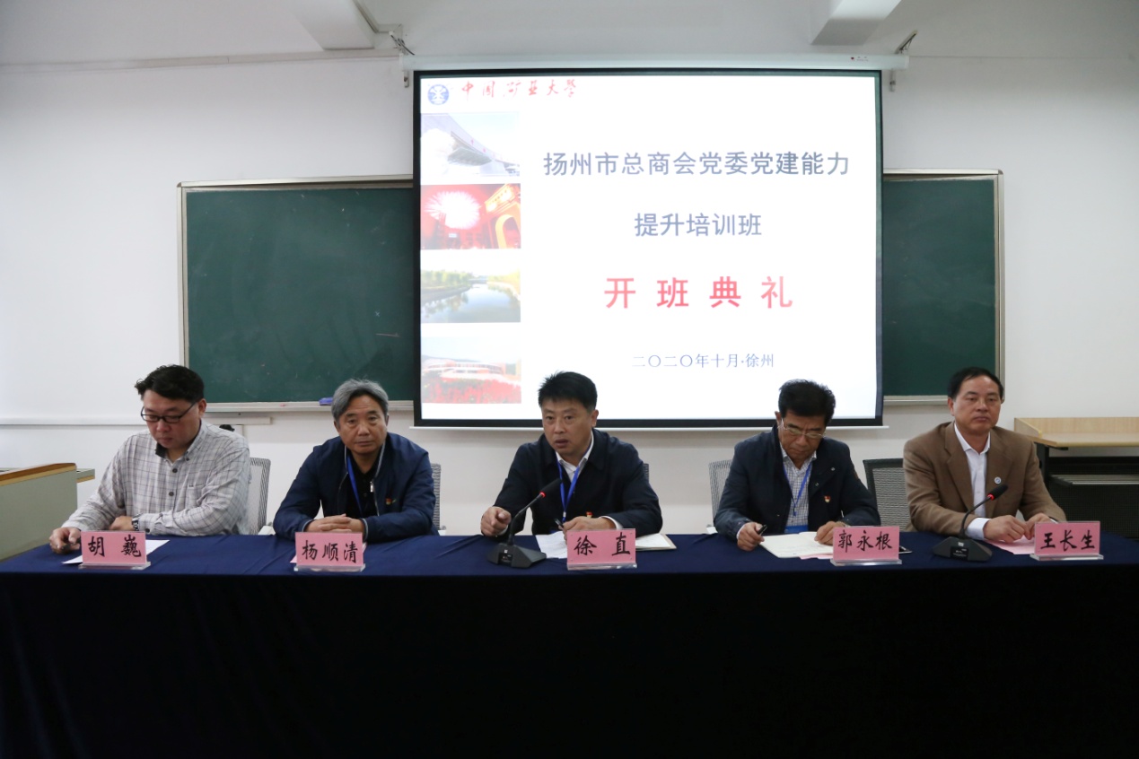 10月27日上午,扬州市总商会党委党建能力提升培训班在我校顺利开班。扬州市工商联党组成员、副主席、市总商会党委副书记徐直,扬州市建苑监理有限责任公司党支部书记扬州市总商会党委委员郭永根,扬州市装饰行业协会(商会)党总支书记扬州市总商会党委委员杨顺清,中国矿业大学继续教育学院院长、教育培训中心主任王长生出席开班典礼。